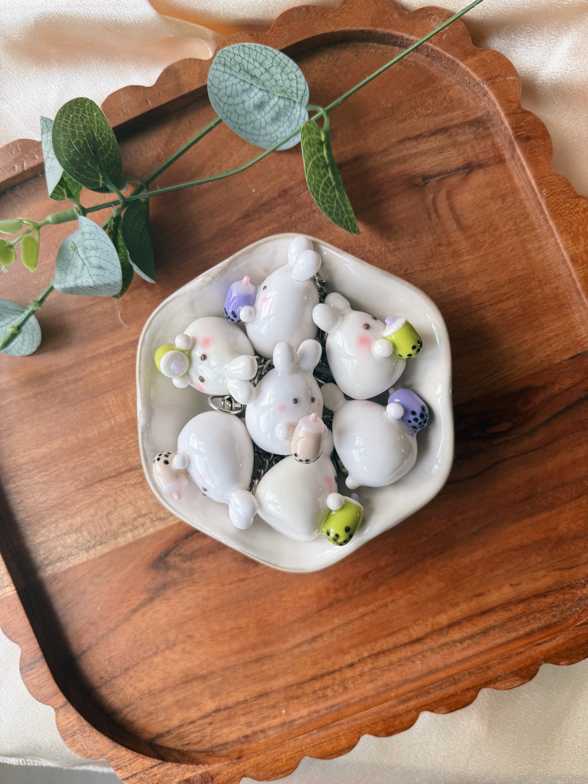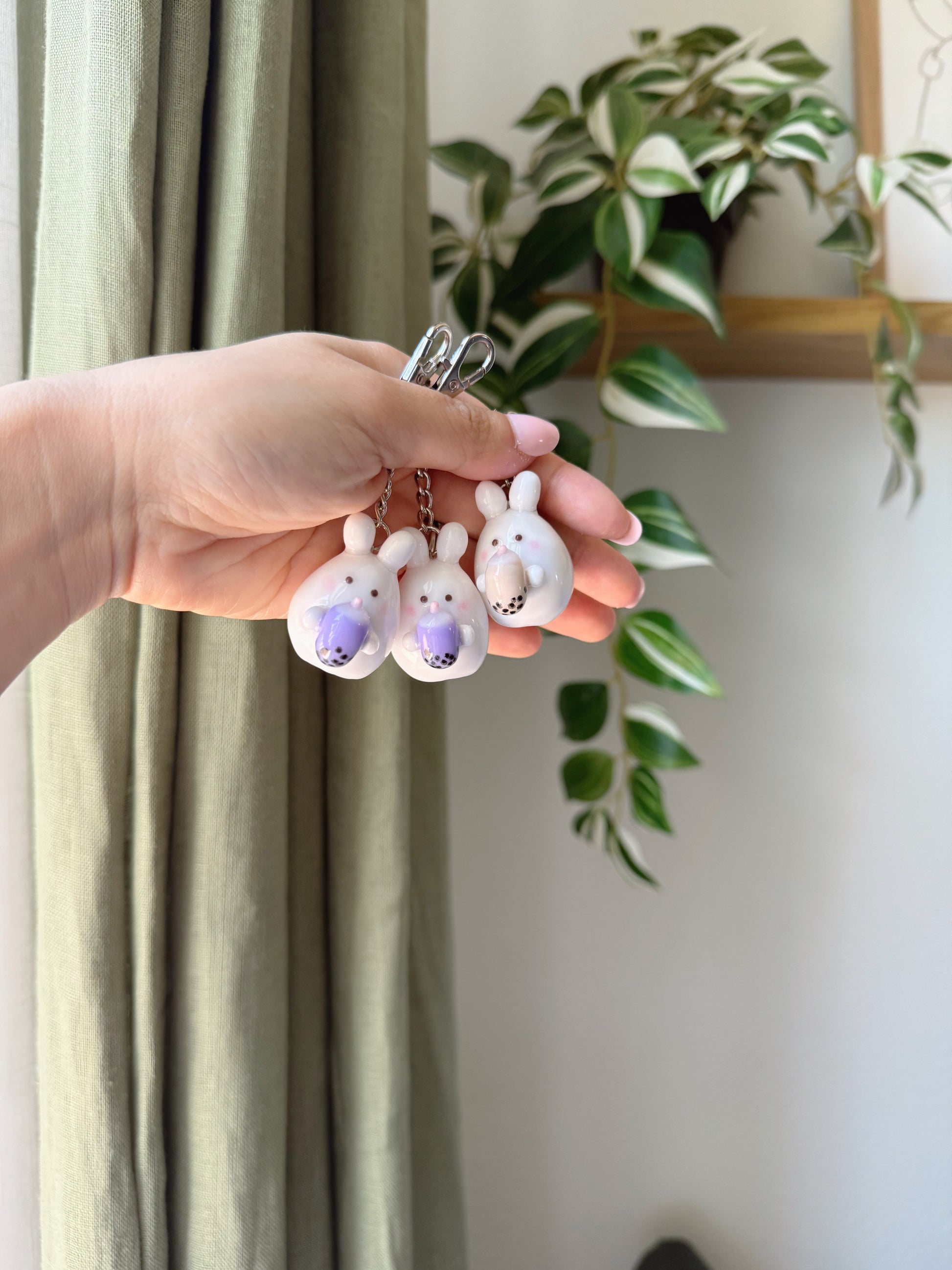 This piece was inspired by my very first art market in a Boba shop. I designed them in my 3 favorite flavors. I hope my boba bunny brings you joy!