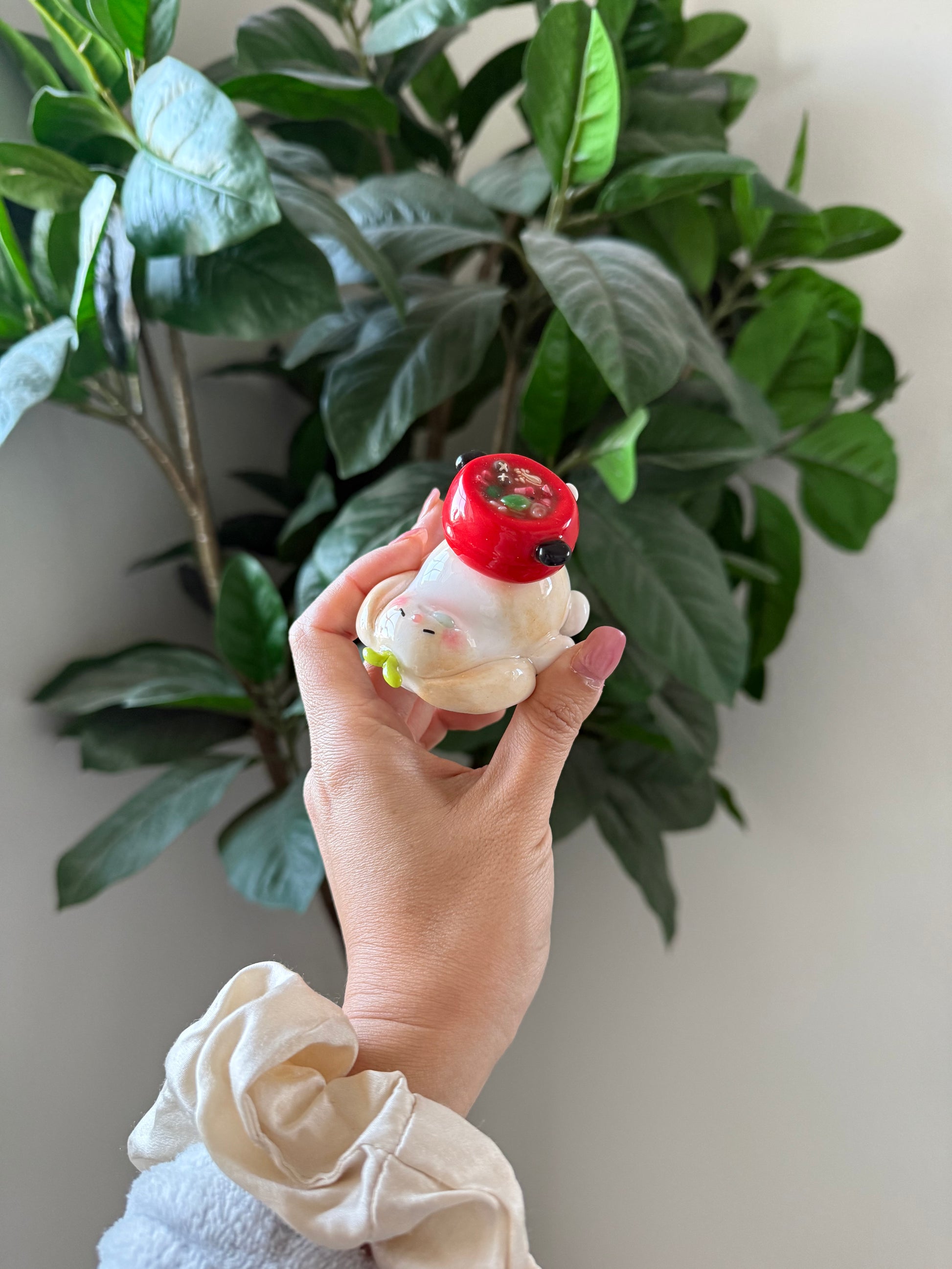 This item is sculpted with polymer clay and glazed with UV resin.
